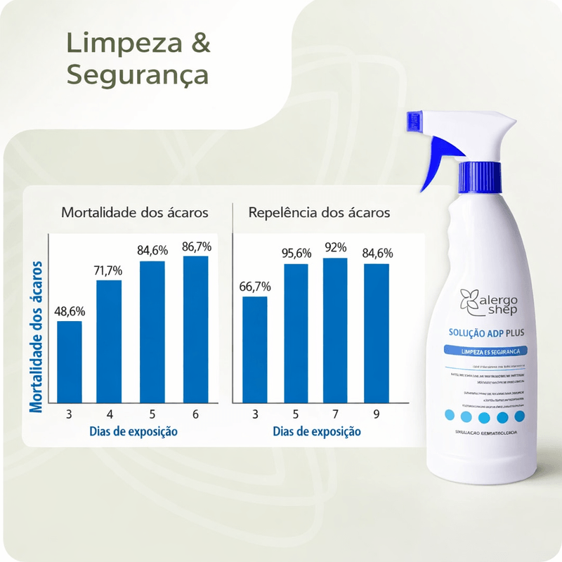 Testes laboratoriais comprovam sua alta eficácia: a Solução ADF Plus 480 ml eliminou 86,7% dos ácaros em até 6 dias após a primeira aplicação e manteve um índice de repelência de 84,6%, mesmo 10 dias após o uso, reforçando sua eficiência no controle contínuo de ácaros e na proteção de ambientes sensíveis.