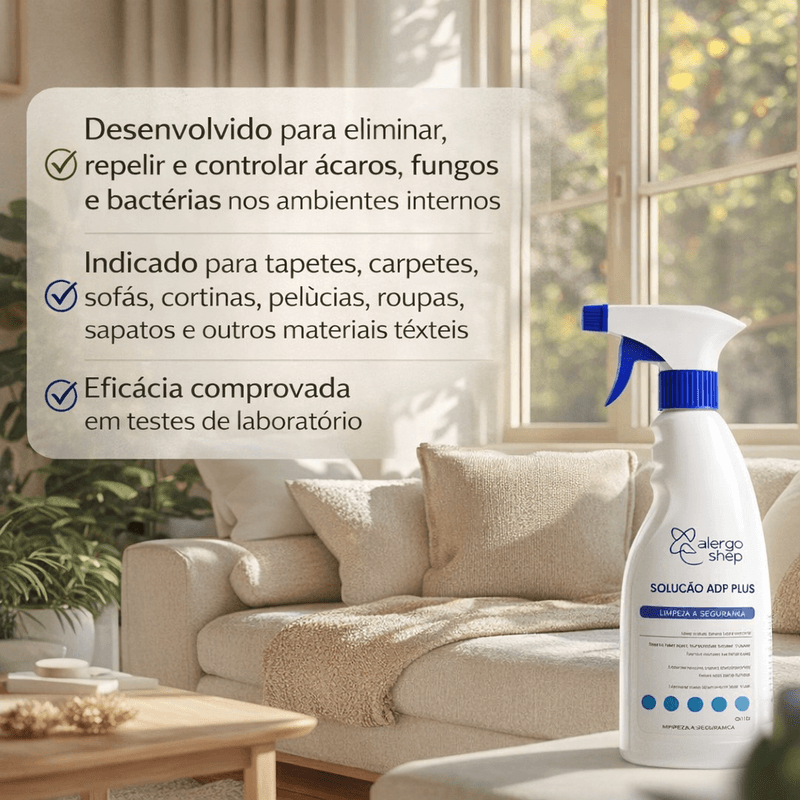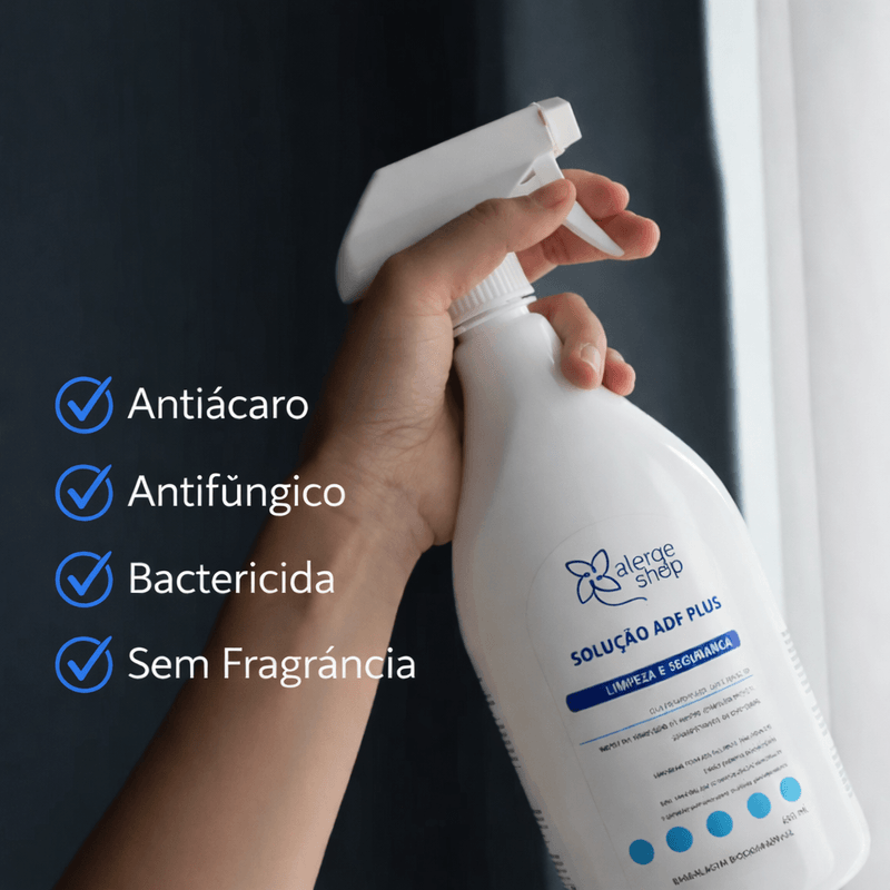 A Solução ADF Plus é um produto hipoalergênico desenvolvido para eliminar, repelir e controlar ácaros, fungos e bactérias nos ambientes internos, mantendo-os mais limpos, seguros e saudáveis. É especialmente indicada para pessoas que sofrem de asma, rinite e bronquite, podendo ser utilizada com tranquilidade inclusive em quartos de crianças, pois é não tóxica e formulada para reduzir o risco de reações alérgicas.