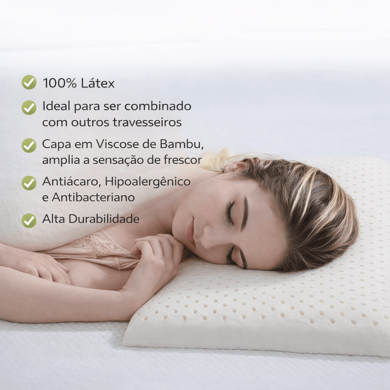 Produzido com látex natural, o travesseiro apresenta consistência macia e resiliente, garantindo conforto inigualável e alta durabilidade. A capa fixa em viscose de bambu é antiácaros, lavável e ajuda a manter a temperatura sempre fresca, além de oferecer toque macio e agradável. Com altura de 7 cm e tamanho ideal para fronha 50 x 70 cm, o Latexlux Slim é a escolha perfeita para quem valoriza bem-estar, frescor e praticidade no dia a dia.